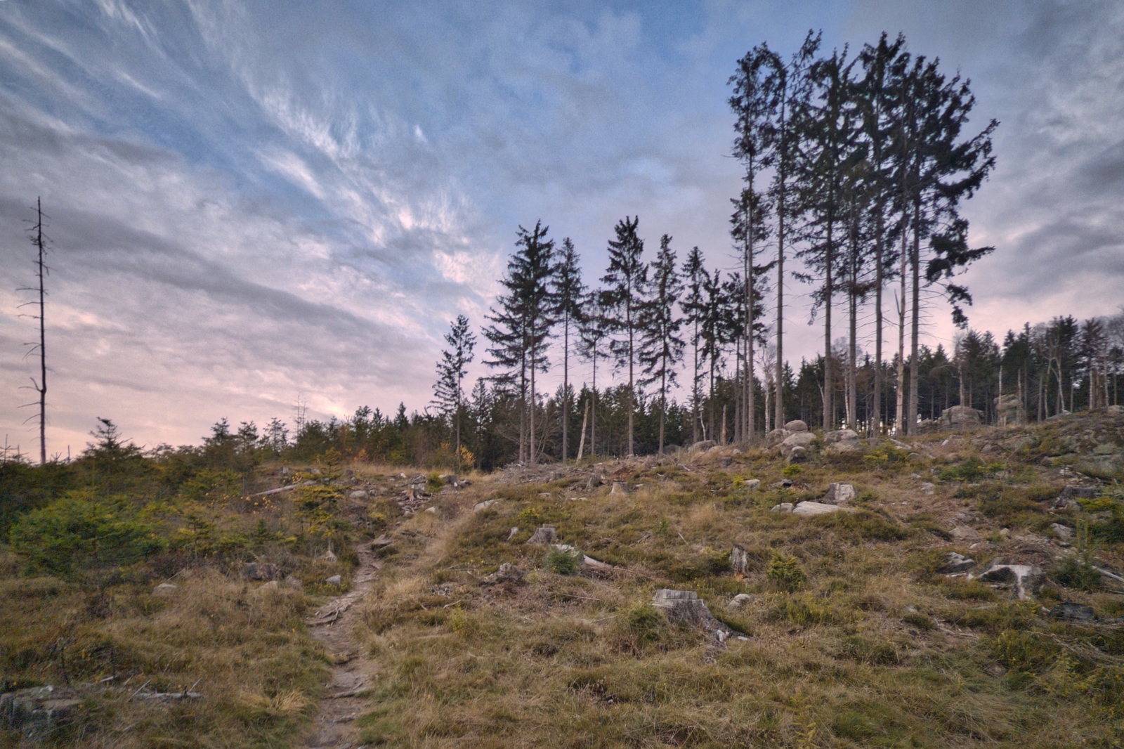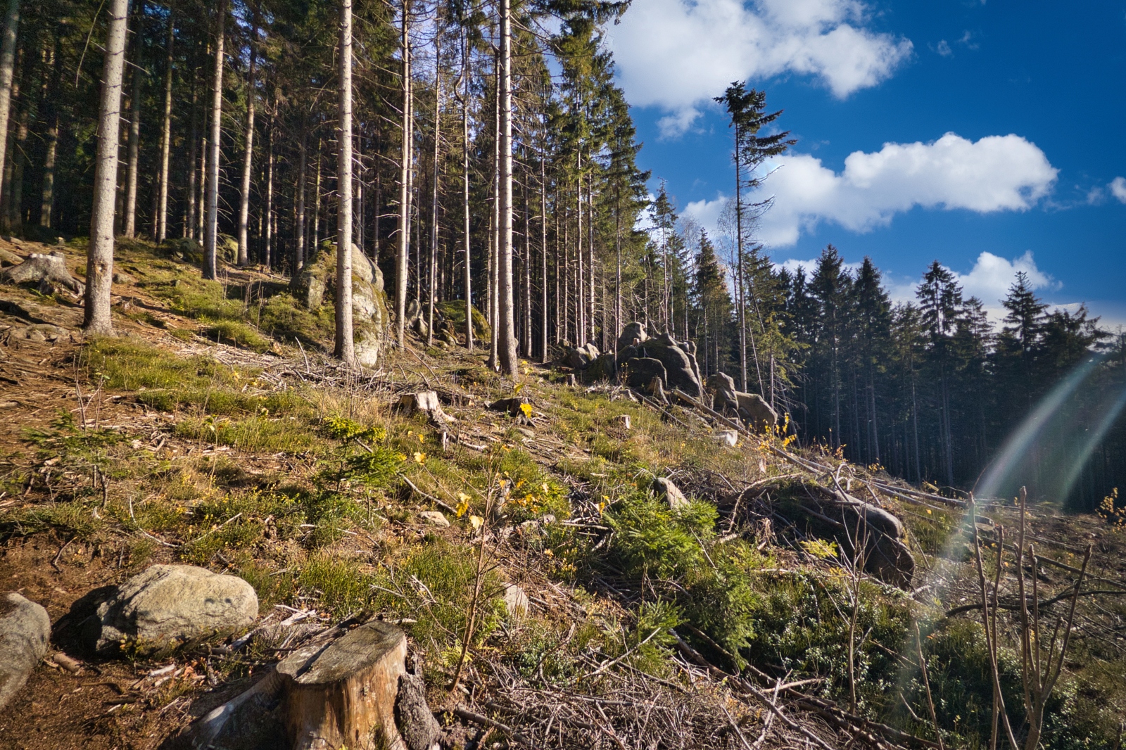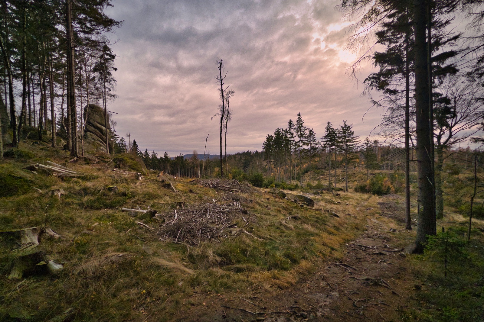 Między Koruną a Božanovskim Špičákiem krajobraz zaczyna się zmieniać — pojawiają się pierwsze poważniejsze skały, las robi się gęstszy, a szlak prowadzi coraz bardziej „broumovsko”.