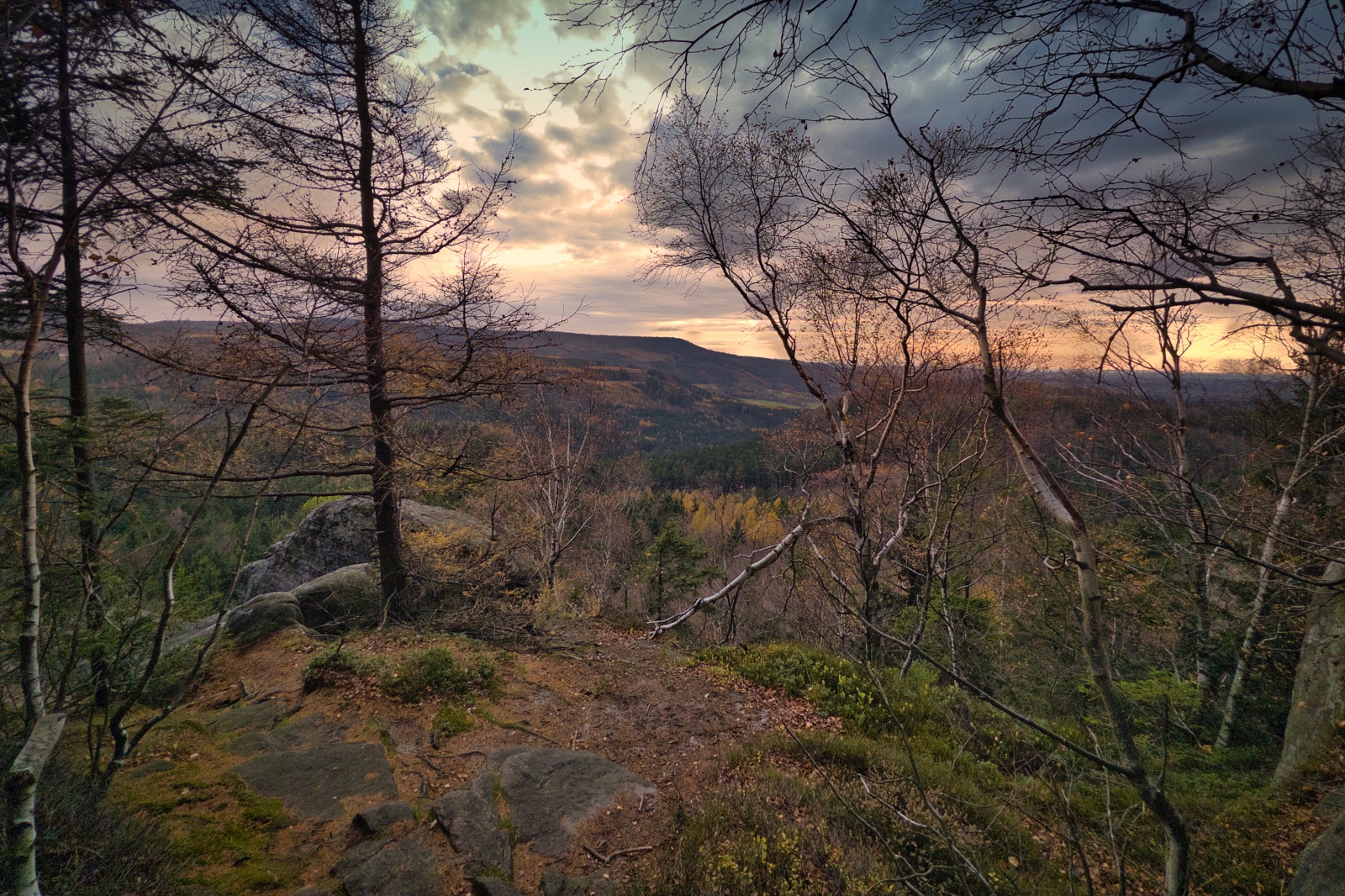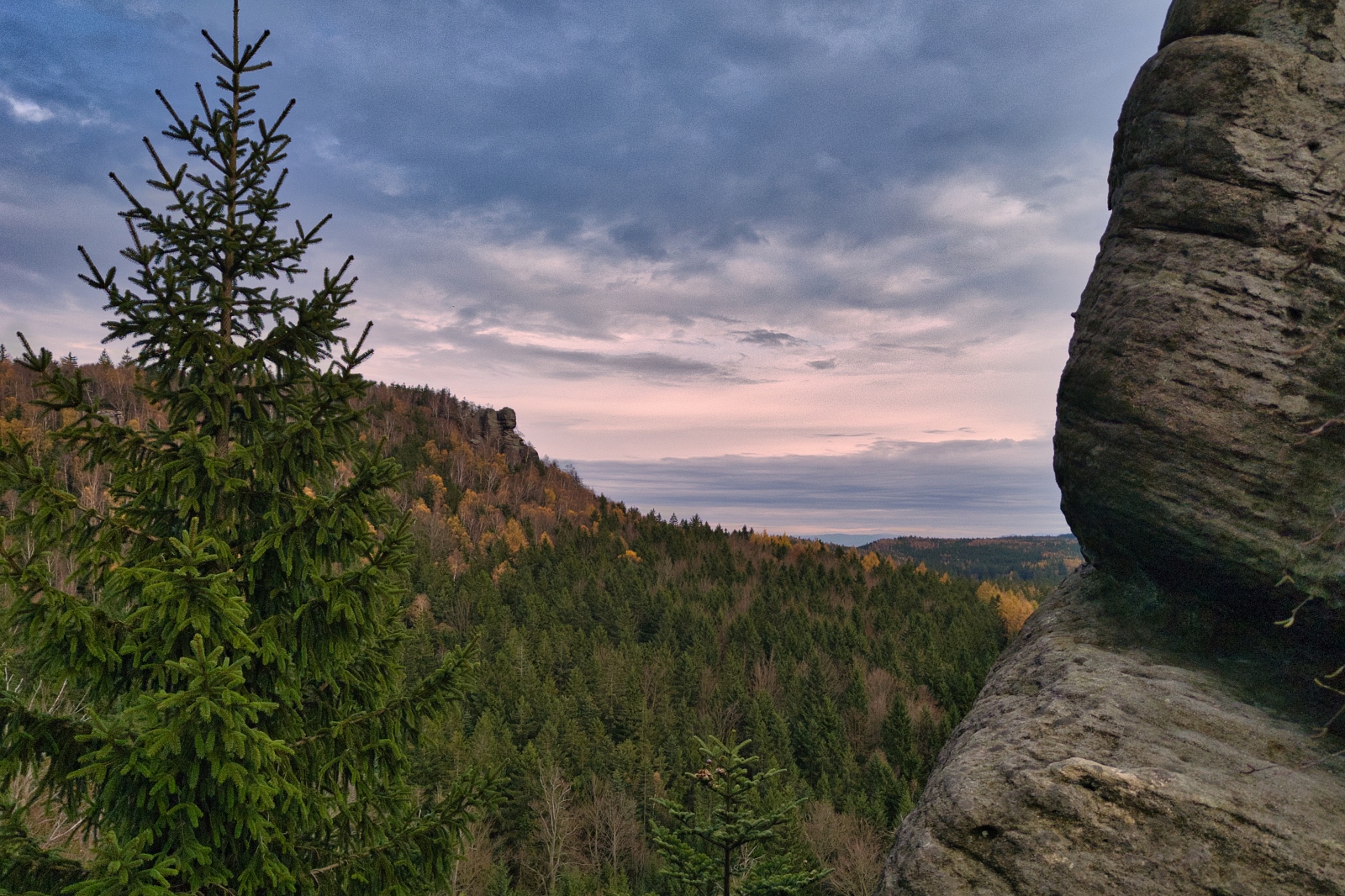 Kiedy docieramy do Junáckiej vyhlídki, szlak przechodzi na poziom „tego właśnie szukaliśmy”. Punkt widokowy oferuje piękne panoramy na okoliczne skały i lasy, a zejście i podejście prowadzi przez malownicze piaskowcowe schody i szczeliny.