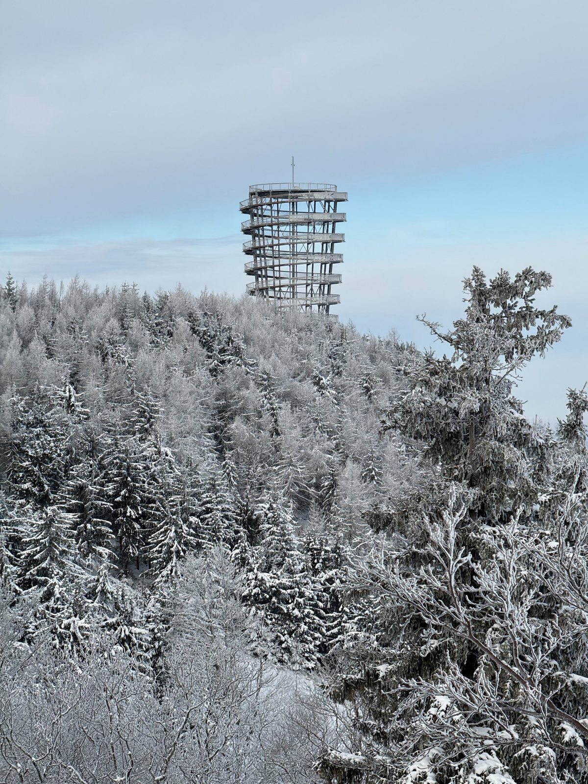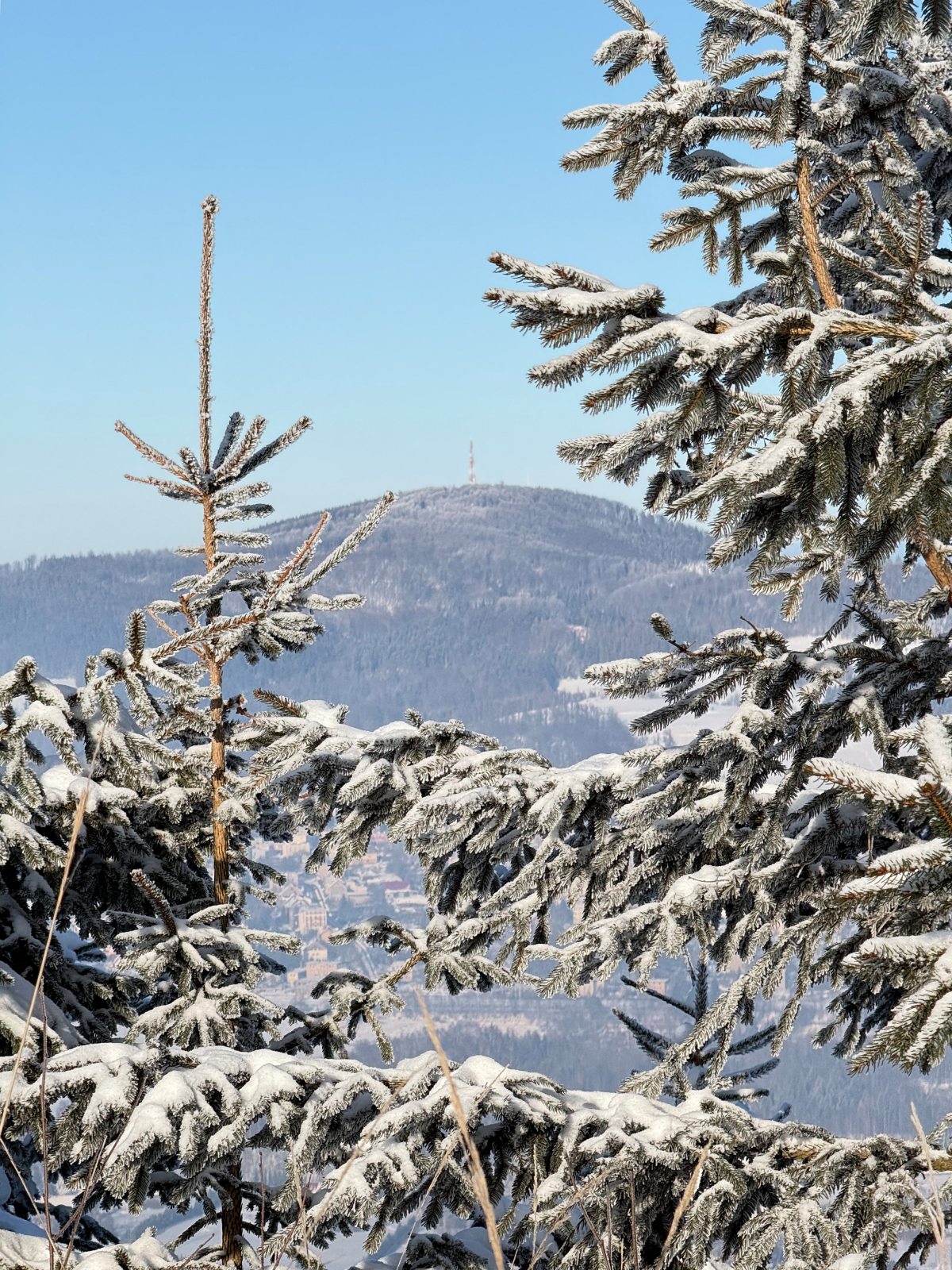 Gdy tylko wysiadłem na górnej stacji, poczułem mocny wiatr. Termometr pokazywał -9°C, ale przez podmuchy odczuwalna temperatura wynosiła chyba z -15°C. Wszedłem na starą wieżę i rozejrzałem się, ale było zbyt zimno na cokolwiek innego niż trzy szybkie spojrzenia na widoki. Czas na powrót! Założyłem raczki (zbawienie!) i poczułem pragnienie. Jakież było moje zdziwienie, gdy zorientowałem się, że napój w rurce zamarzł na kość…
